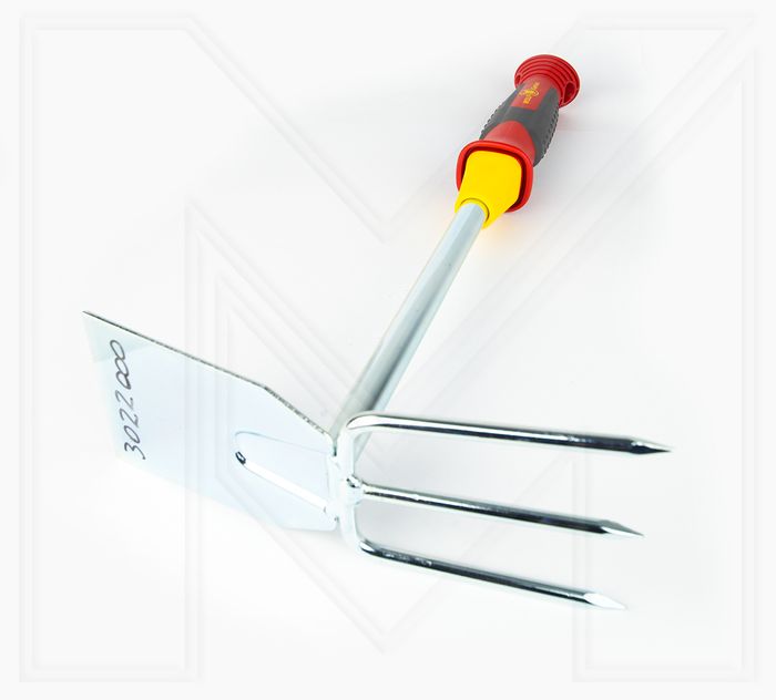 The WOLF-GartenĀ® Double Hoe makes garden planting a snap. Three steel cultivating tines quickly weed and break up soil, which then allows the sharp steel blade of the garden hoe to create perfect rows for planting seeds and bulbs.
