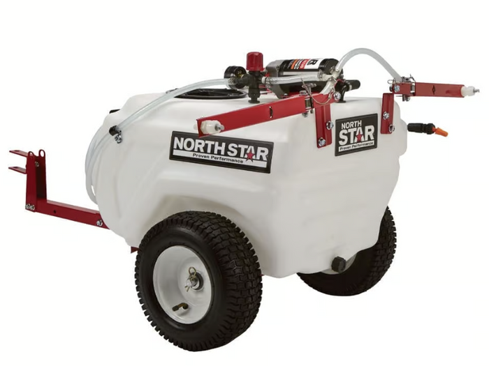 The versatile, high-end NorthStar® Tow-Behind Trailer Boom Broadcast and Spot Sprayer give you the ability to do both precision and wide-coverage spraying. Equipped with a commercial-grade NorthStar NSQ Series® pump, it provides easier priming, exceptional durability and superior resistance to harsh environments and corrosive chemicals. The completely redesigned, the over-sized tank is secured to a heavy-duty 100% steel cart that handles the roughest terrain. A retractable tow-bar, foldable boom arms and removable axle and wheels allow for ultra-compact storage. Litres marks are moulded into the tank for easy fluid level monitoring. Tow behind your ATV or lawn/garden tractor.