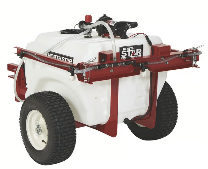 The versatile, high-end NorthStar® Tow-Behind Trailer Boom Broadcast and Spot Sprayer give you the ability to do both precision and wide-coverage spraying. Equipped with a commercial-grade NorthStar NSQ Series® pump, it provides easier priming, exceptional durability and superior resistance to harsh environments and corrosive chemicals. The completely redesigned, the over-sized tank is secured to a heavy-duty 100% steel cart that handles the roughest terrain. A retractable tow-bar, foldable boom arms and removable axle and wheels allow for ultra-compact storage. Litres marks are moulded into the tank for easy fluid level monitoring. Tow behind your ATV or lawn/garden tractor.